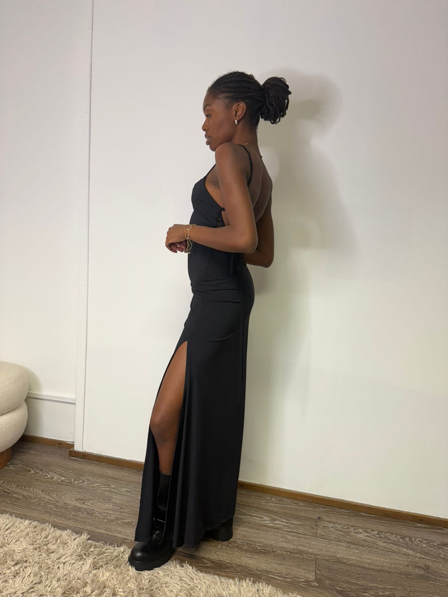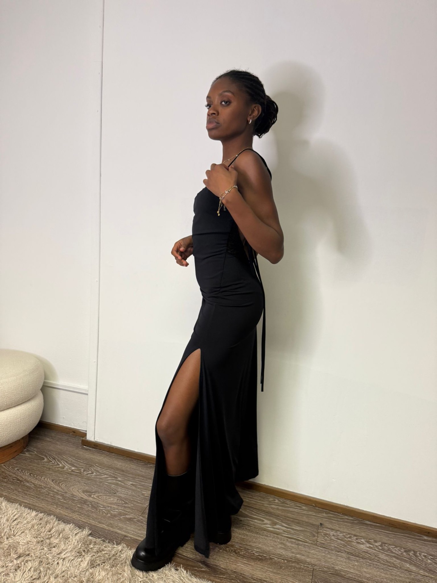 Abito lungo con scollo su schiena e spallo laterale
