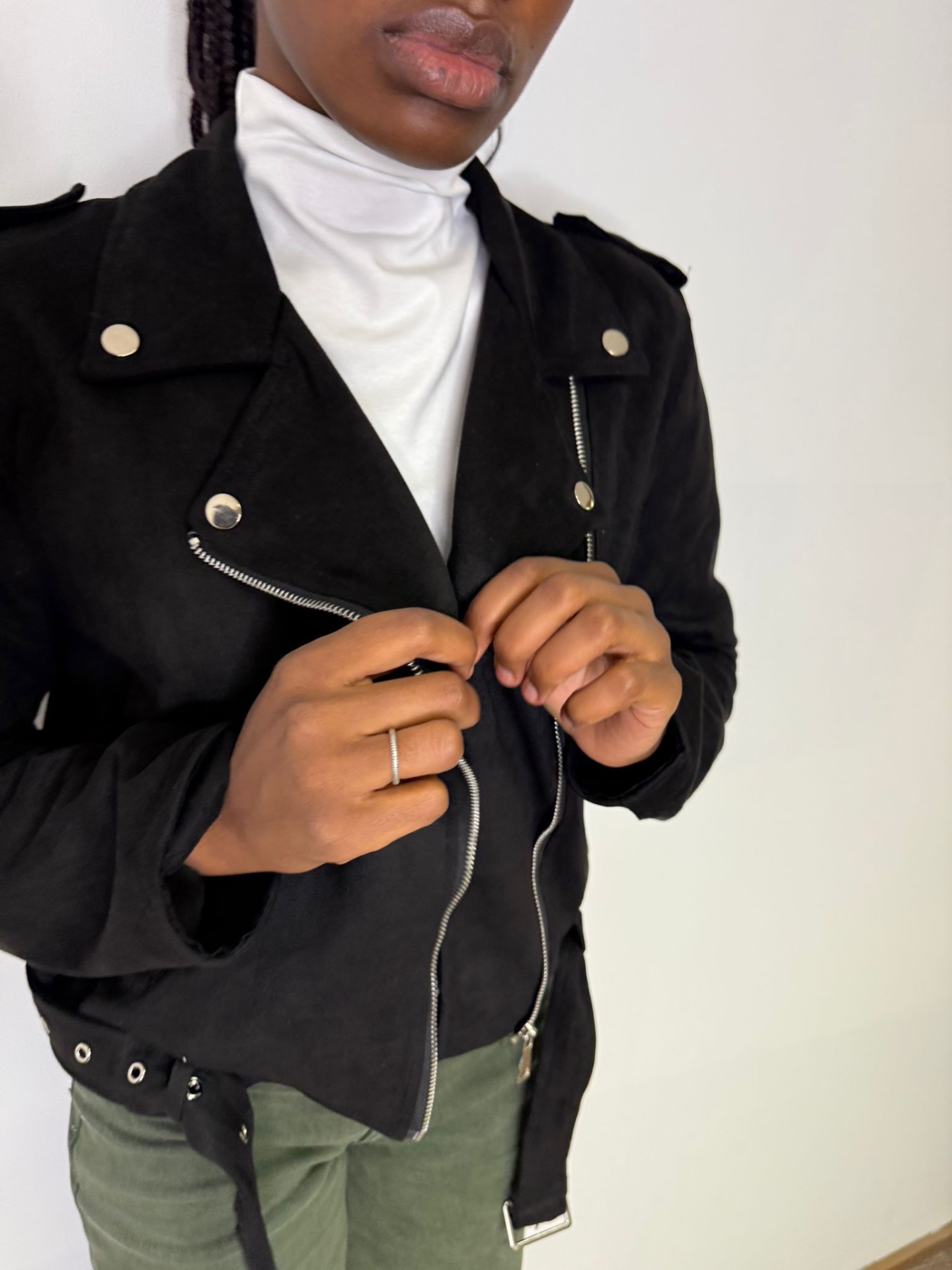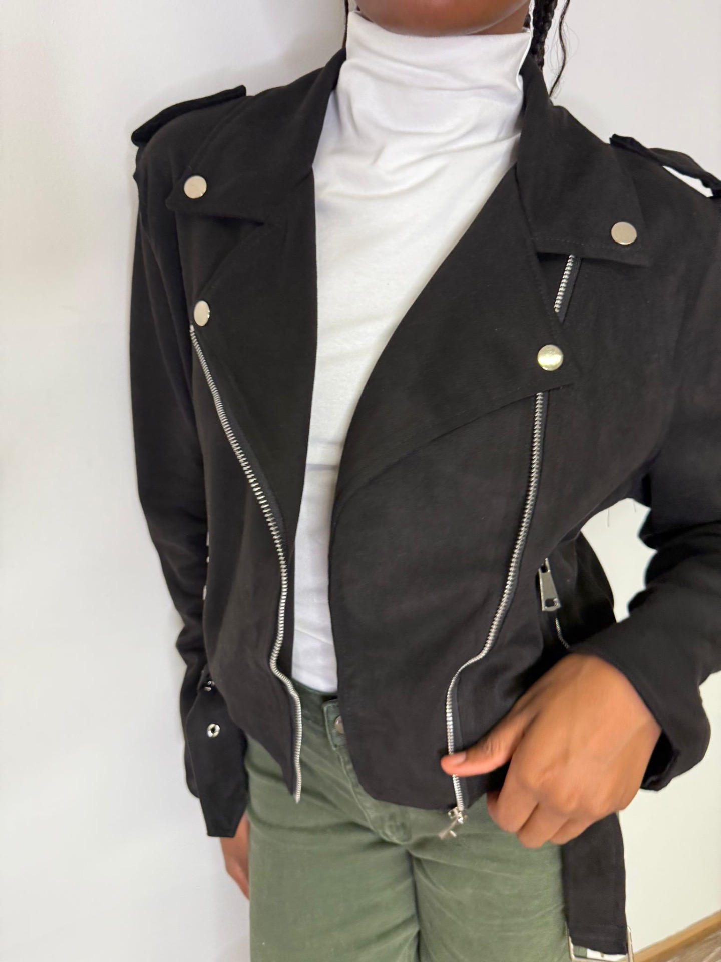 Chiodo in suede con cerniera e dettagli argento.