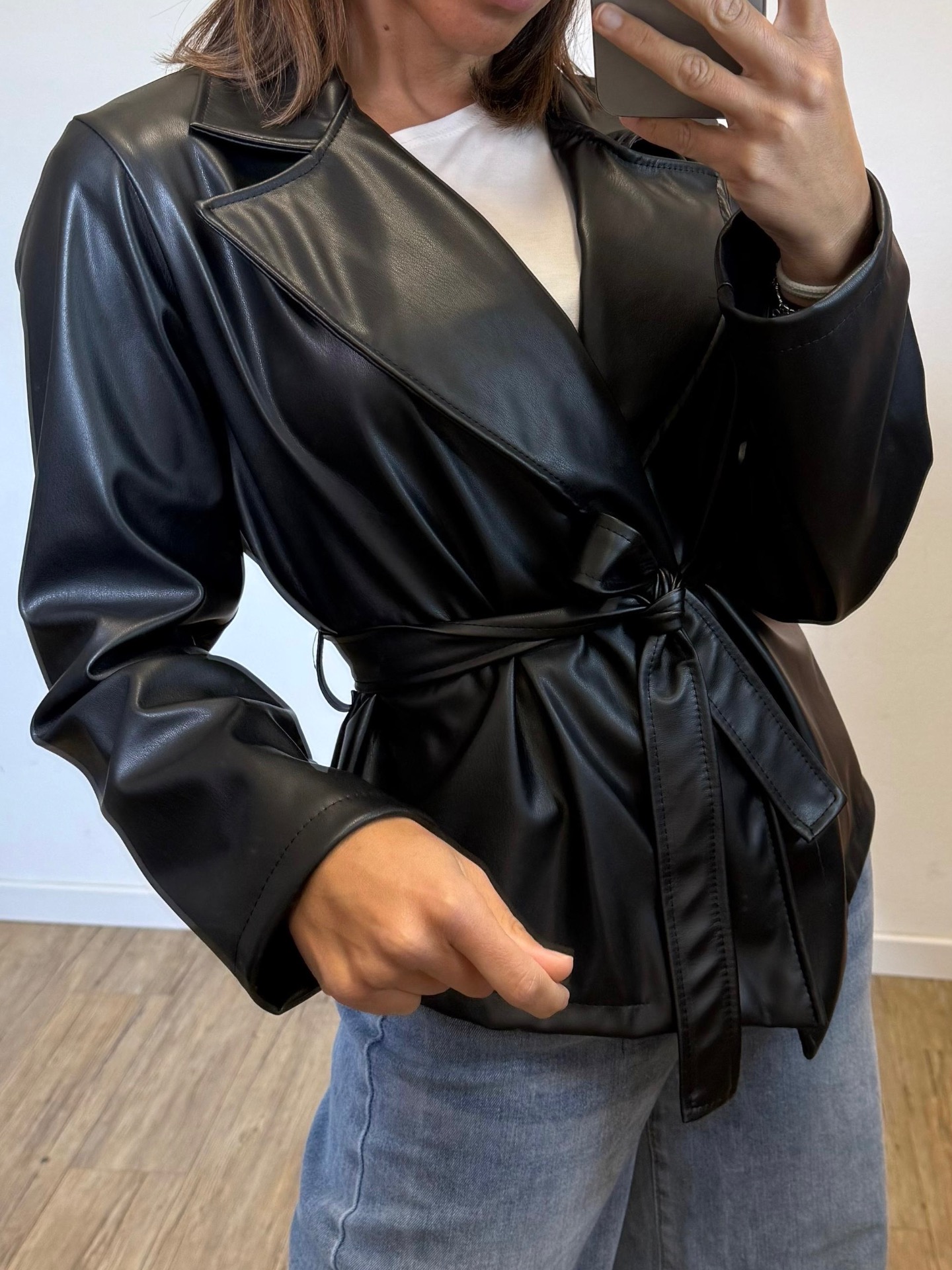 trench corto in eco-pelle con cintura in vita